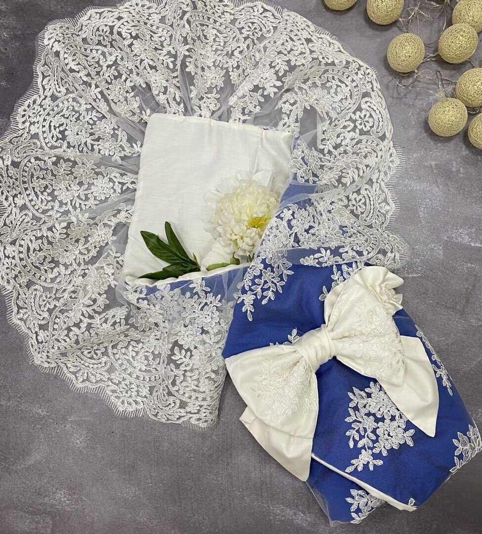 Кольорова гама - поєднання білого та синього (електрик). Мереживо золотисте, золото