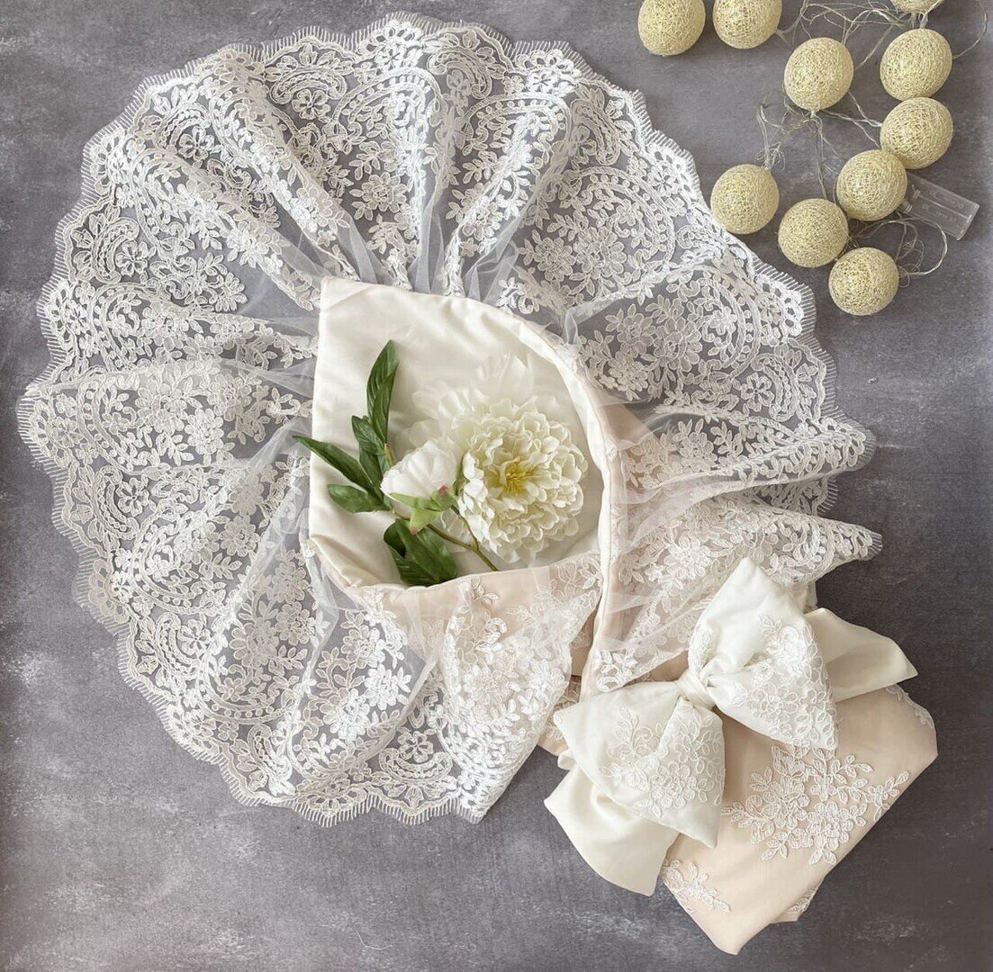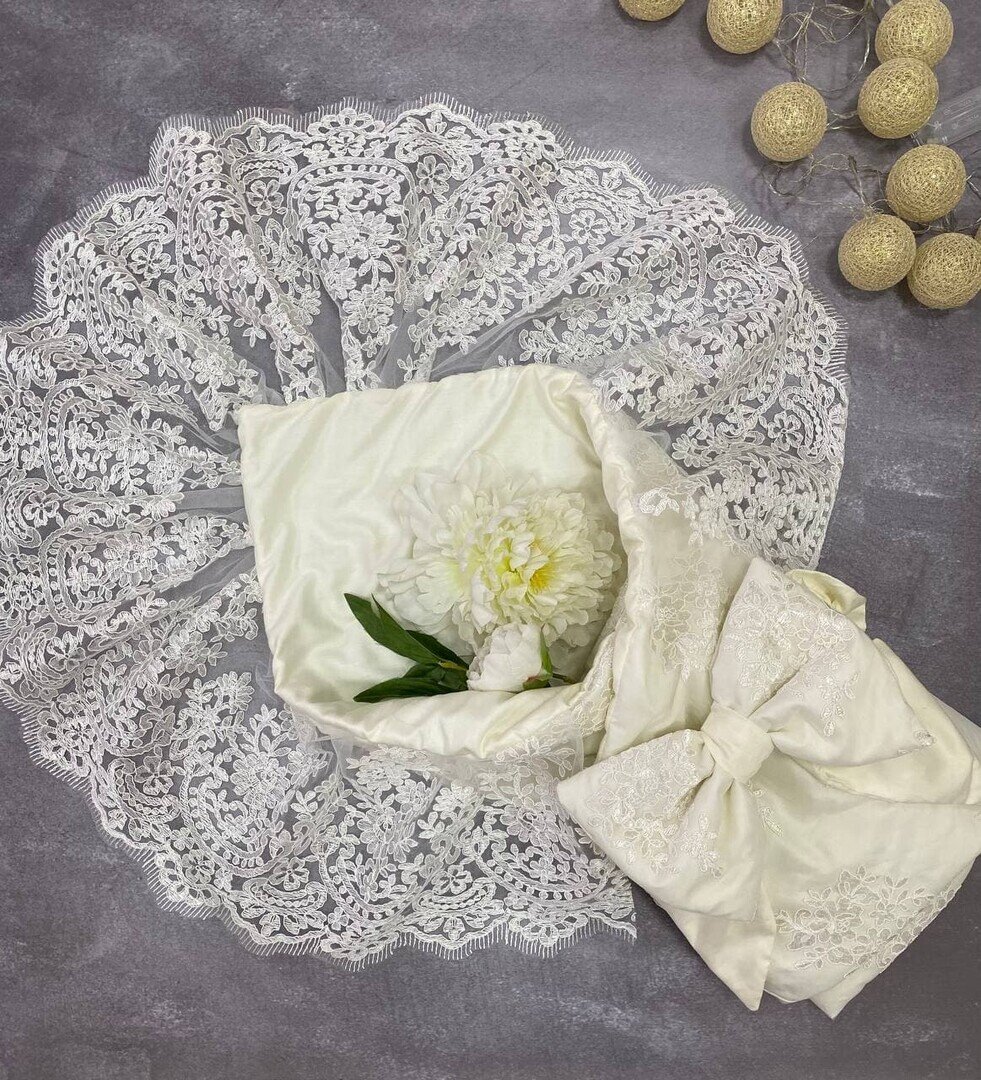 Кольорова гама - білий, білосніжний. Мереживо підібрали в тон до тканини.