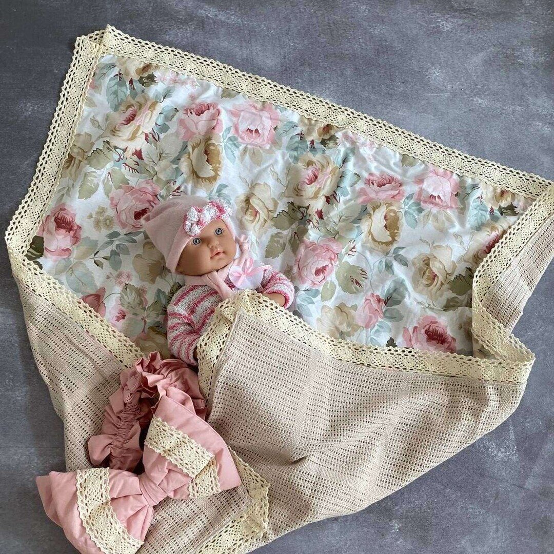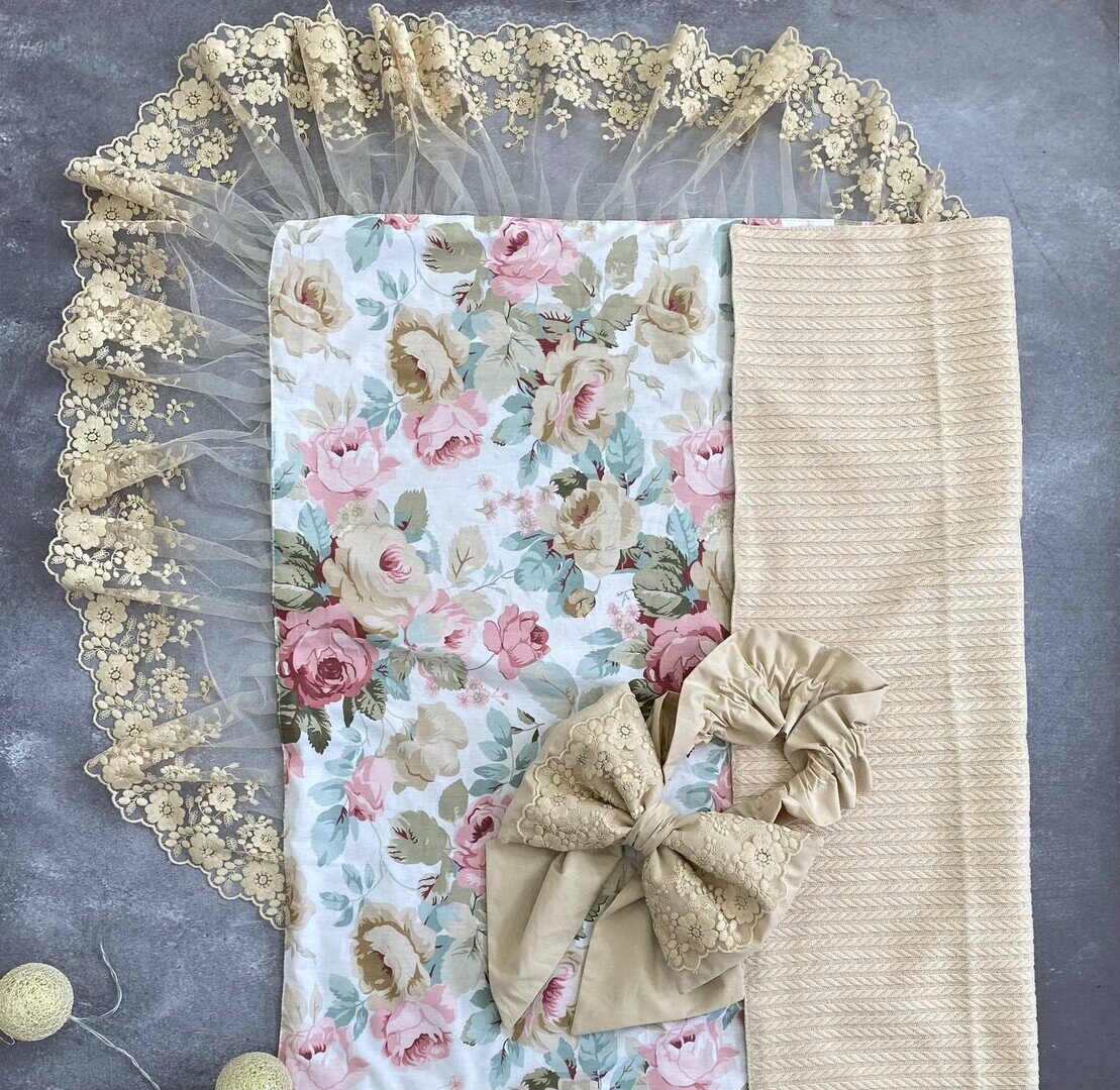Літній конверт-ковдра з мереживом (квітковий принт / піке косичка) 34317