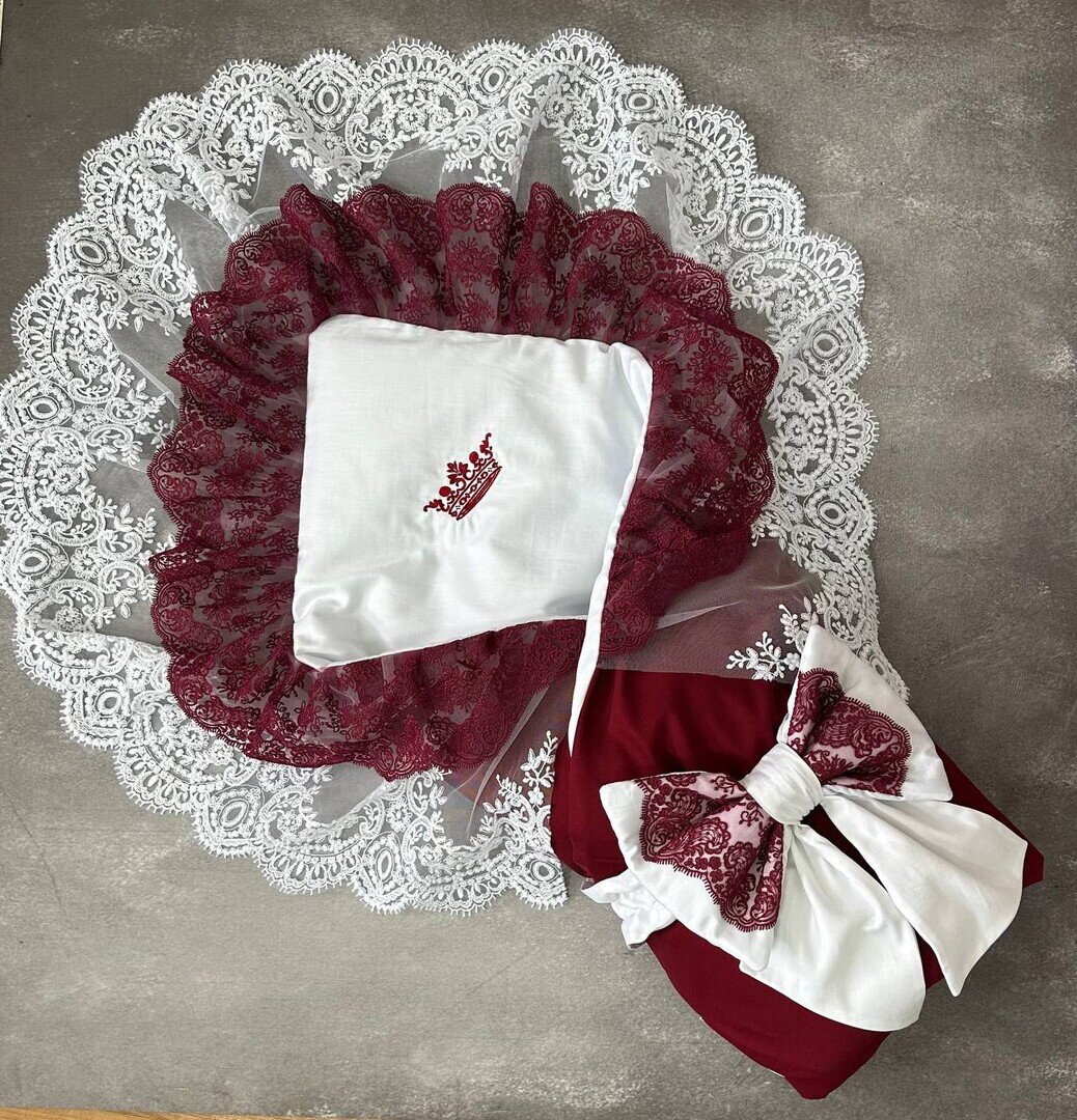 Кольорова гама - поєднання білого та винного (бордо). Мереживо підібрали в тон до тканини.