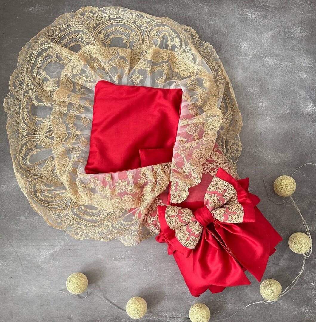Конверт-ковдра на виписку червоного кольору з мереживом в 2 ряда